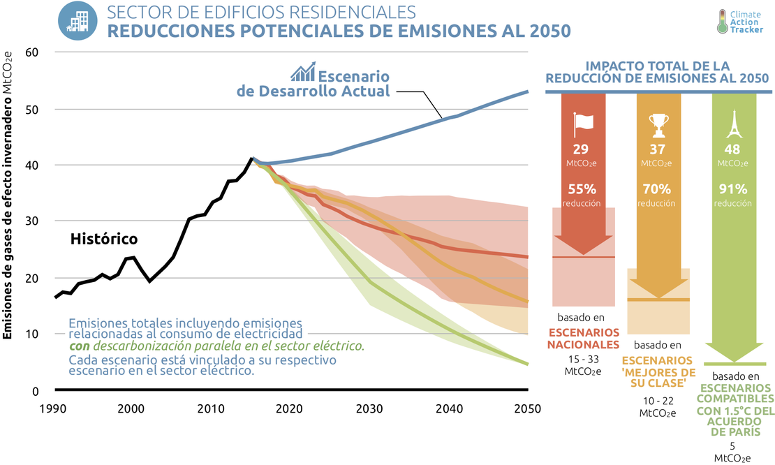 Incluso sin ninguna otra acción climática en el sector de suministro de electricidad más allá de los planes actuales, las políticas antes mencionadas en el sector de edificios residenciales de Argentina podrían reducir las emisiones hasta en un 31 % por debajo de los niveles actuales para 2050.