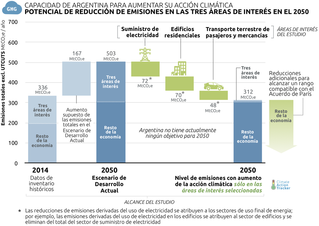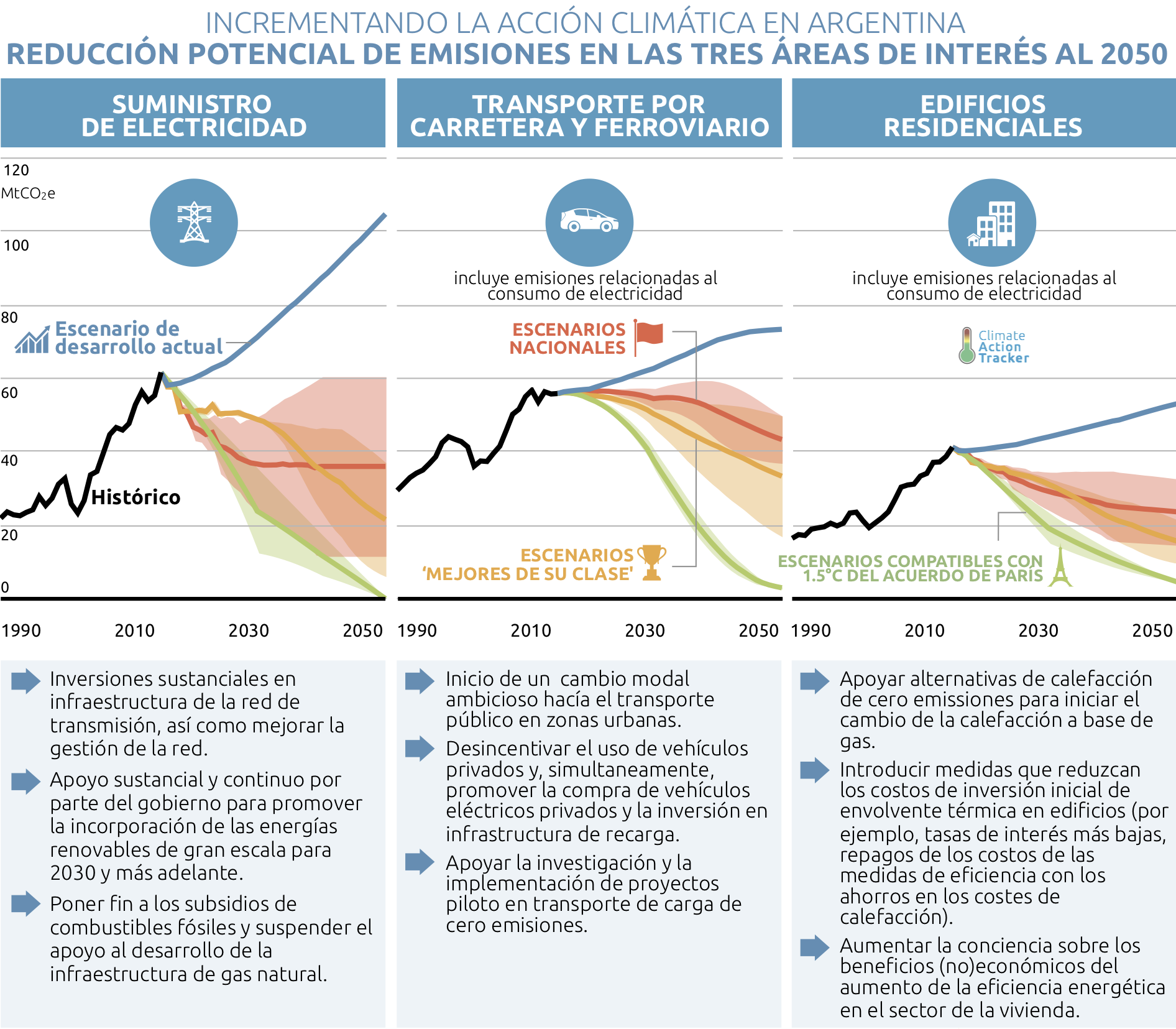 El incremento de la acción climática en el suministro de electricidad de Argentina, en el sector de edificios residenciales y en el transporte terrestre de pasajeros y mercancías – los cuales representan alrededor del 40% de las emisiones de Argentina en 2014 – puede descarbonizar exitosamente estos sectores para 2050. Incrementar la acción climática ahora iniciaría transiciones sectoriales técnicamente viables hacia una sociedad de cero emisiones y, al mismo tiempo, reforzaría directamente la agenda de desarrollo sostenible de Argentina, incluyendo la reducción de los efectos adversos para la salud a causa de la contaminación atmosférica y una mayor participación y justicia social en la movilidad y la vivienda.