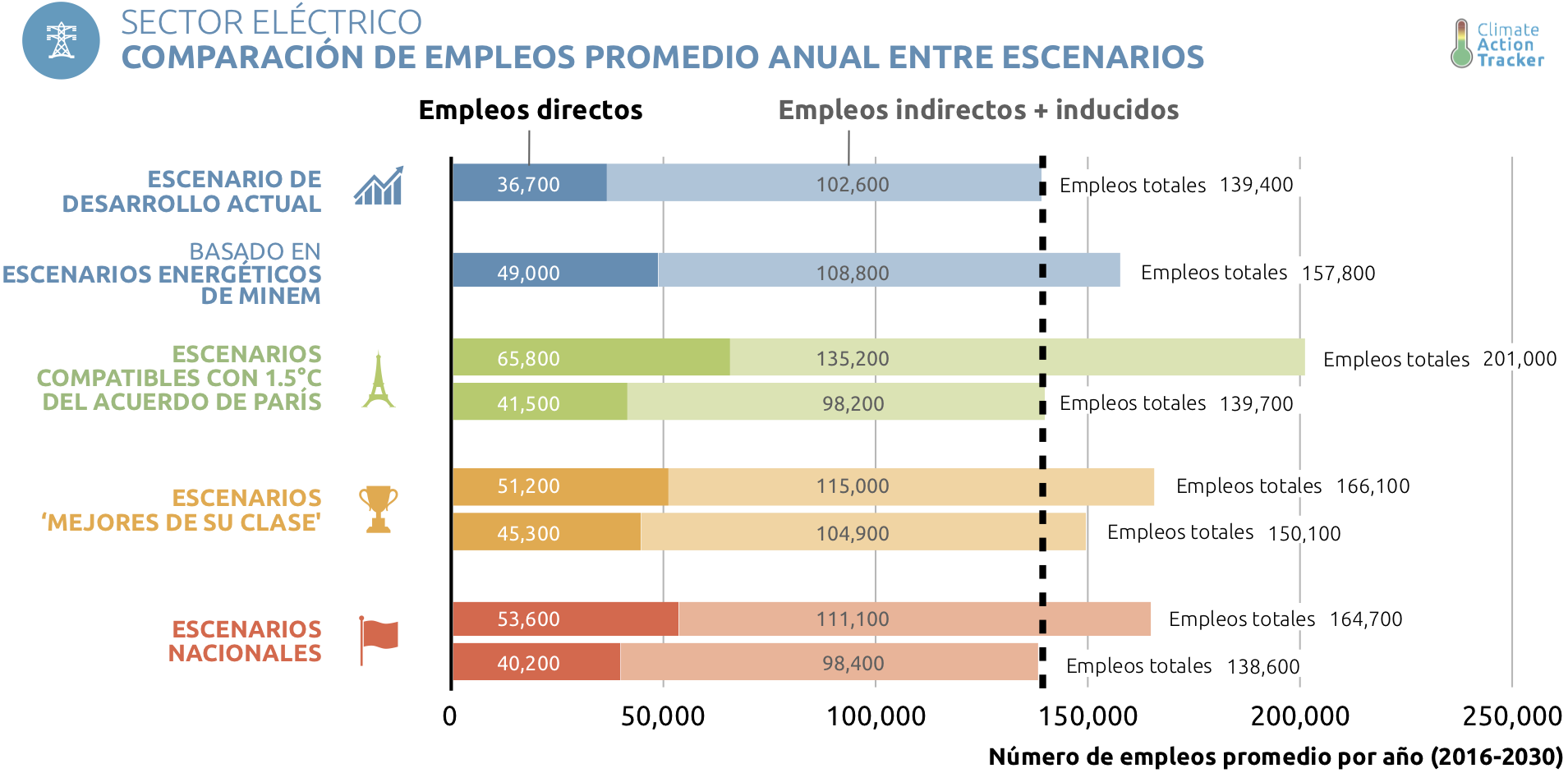 En un escenario de desarrollo actual, aproximadamente 37.000 personas al año como promedio están directamente empleadas en el desarrollo de nueva capacidad de suministro de electricidad y en la operación y mantenimiento de la capacidad existente y nueva durante el período 2016 - 2030. El CAT estima que estas inversiones estimularían otros 103.000 empleos indirectos e inducidos al año como promedio, tales como empleos en la producción de cemento para los cimientos de concreto de las turbinas eólicas.
