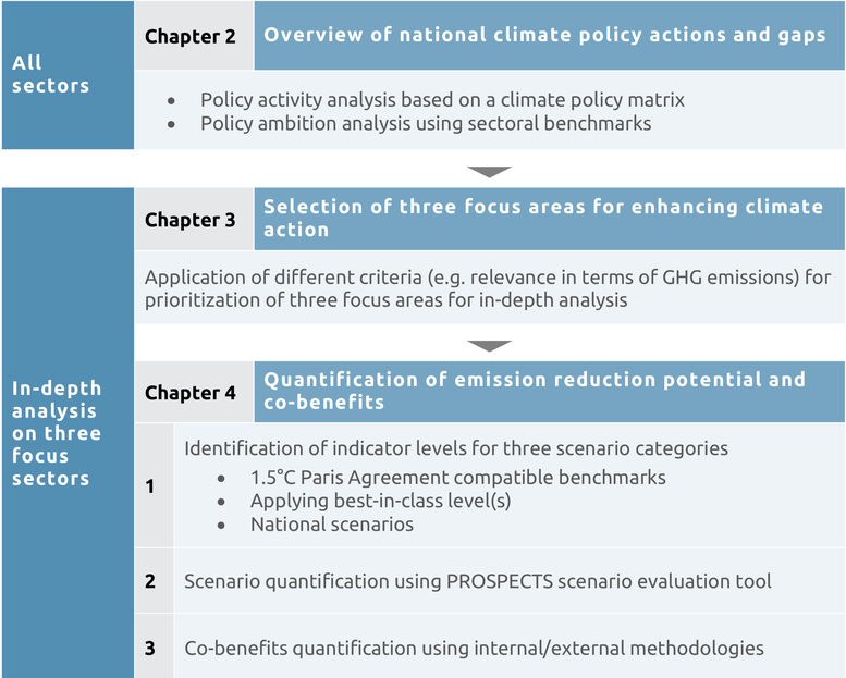 Based on this overview and rating as well as on additional considerations of country-specific circumstances, each report focuses on three areas for in-depth analysis on accelerated climate action (Chapter 3). This in-depth analysis comprises the quantification of mitigation impacts using PROSPECTS scenario evaluation tools and selected co-benefits (Chapter 4).