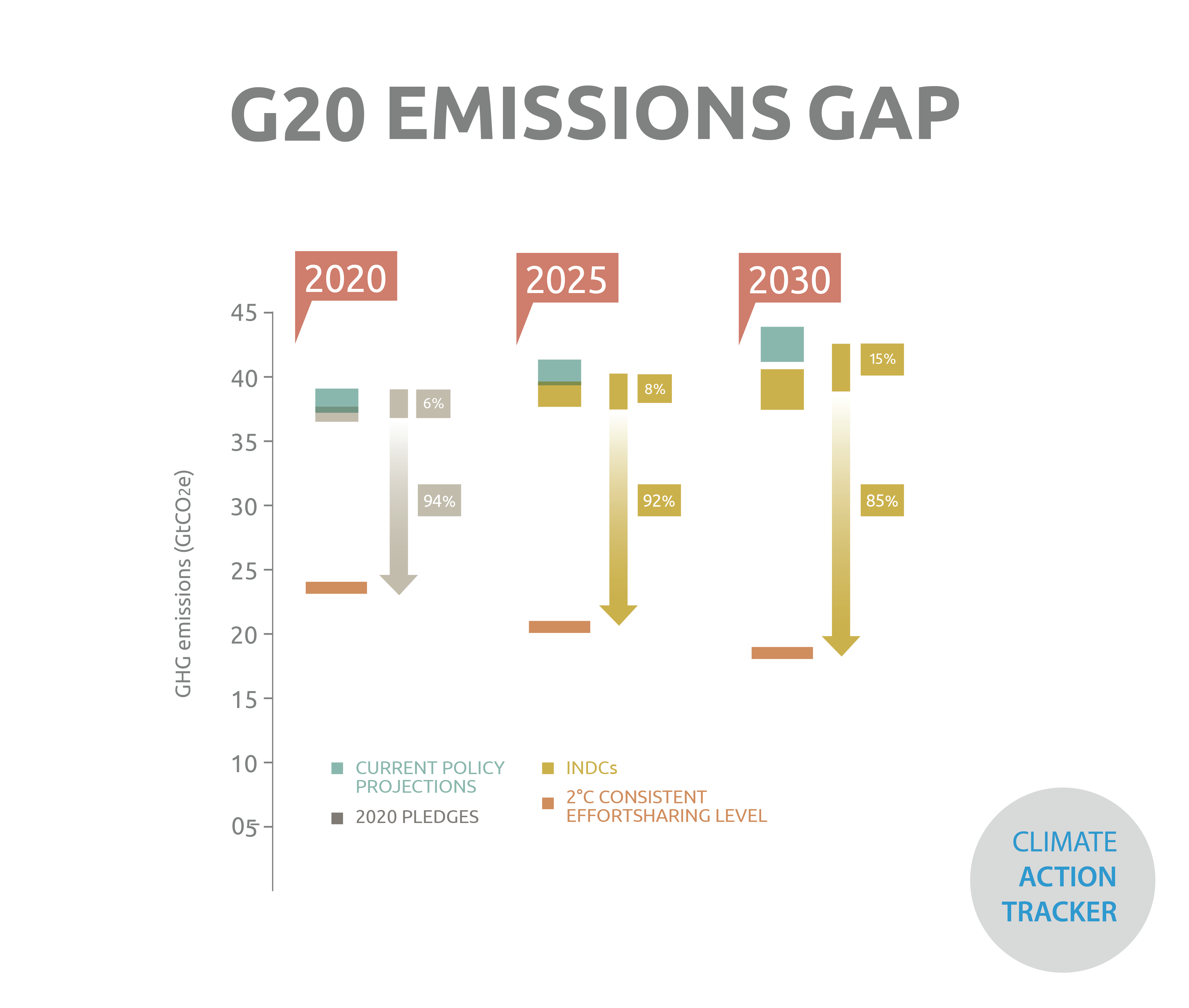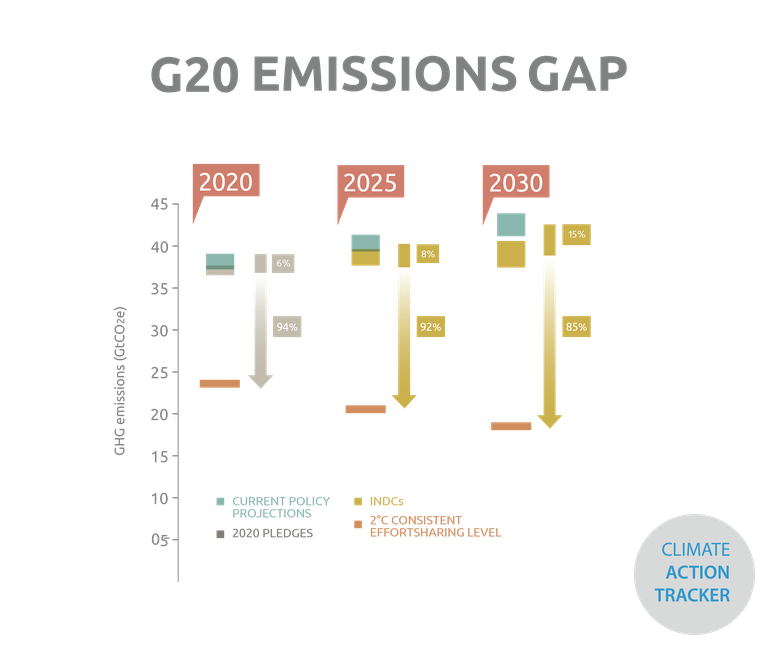 None of the G20 INDCs are in line with holding warming below 2°C, or 1.5°C. Taken together, the CAT finds that a very large emissions gap remains.