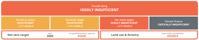 In the updated NDC, Australia commits to achieving net zero emissions by 2050, reiterated in Australia’s Long-term Strategy (LTS). Overall, the LTS relies heavily on the future development of low-emissions technology, along with land use reductions and international offsets, with no plans to phase out coal, curb fossil fuel exports, or hold heavy polluters accountable. Further analysis of Australia’s net zero emissions will be available shortly here.