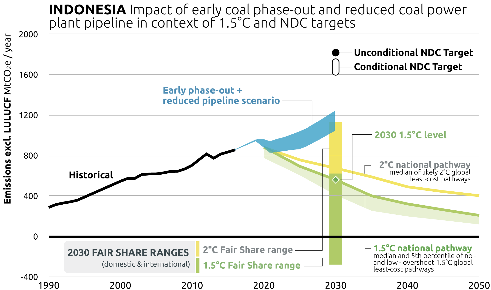 Re-evaluating coal dependency presents a huge potential to scale up the ambition of Indonesia’s NDC, which presents an unconditional, 2030 emissions target of 1,817 MtCO2e, excluding LULUCF. Indonesia is very likely to overachieve its 2030 Paris Agreement targets, excluding the forestry sector, with currently implemented policies, despite the lack of additional climate change mitigation measures . The current target is not in line with any interpretation of a “fair” approach to the Paris Agreement’s 1.5°C limit but Indonesia does not intend to update it before COP26.