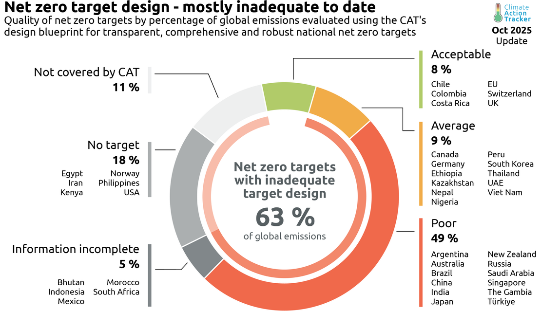 Governments need to improve their net zero target design. According to the CAT’s “good practice” net zero analysis, the design of net zero targets covering a total of 63% of global emissions remains insufficient (Figure 3).