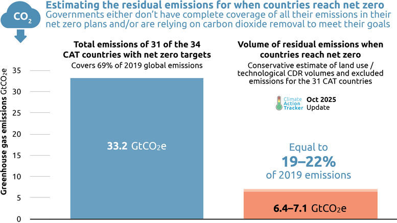 Figure 4: Conservative estimates of total remaining emissions in respective net-zero target years by 31 countries that cover 69% of 2019 global emissions. Estimates based on information and data tracked by the Climate Action Tracker (CAT) as of October 2025.