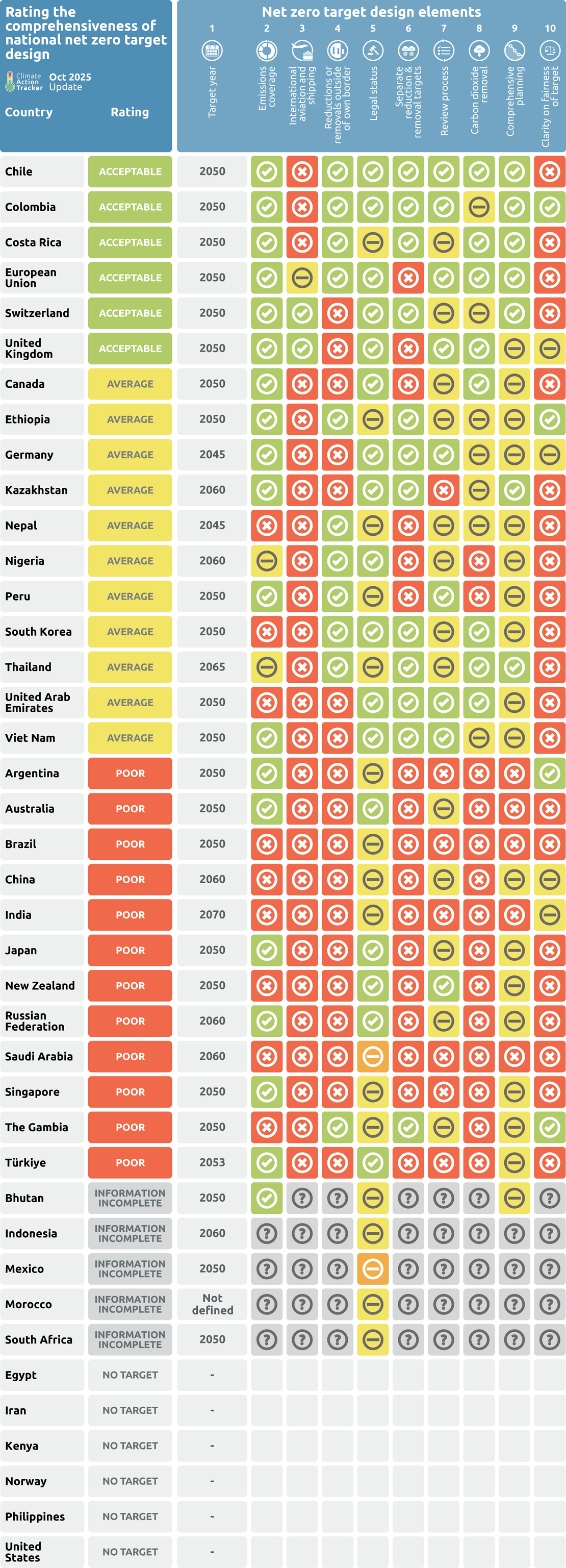Our net zero evaluations for G20 countries and selected other countries as of October 2025 show that most net zero targets are formulated vaguely and do not yet conform with good practice across different design elements. Robust short-term targets and pathways towards achieving them will be required to fully realise their ambition.