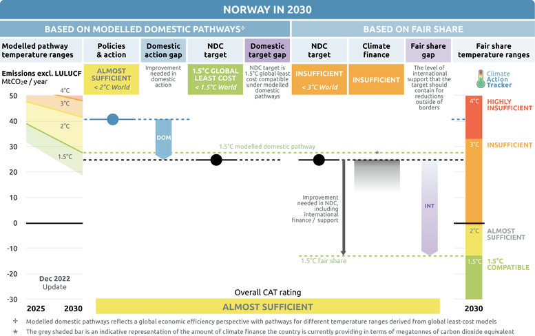The CAT rates Norway's NDC target as aligned with least cost modelled domestic pathways which limit warming to 1.5°C and "Insufficient" when rated against its fair share contribution. As Norway does not have an emissions reduction target that includes non-domestic emissions reductions, as is the case with Switzerland, for example, we rate its NDC target against the two rating frameworks.