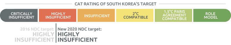 South Korea submitted its updated NDC in December 2020. Compared to its previous submission, South Korea has now put forward an absolute mitigation target instead of a reduction compared to a business as usual (BAU) scenario. Because the previous NDC provided this scenario in absolute terms, the previous NDC target was de facto also absolute. The updated NDC does not change the targeted 2030 emissions level in absolute terms and represents no enhancement of ambition.