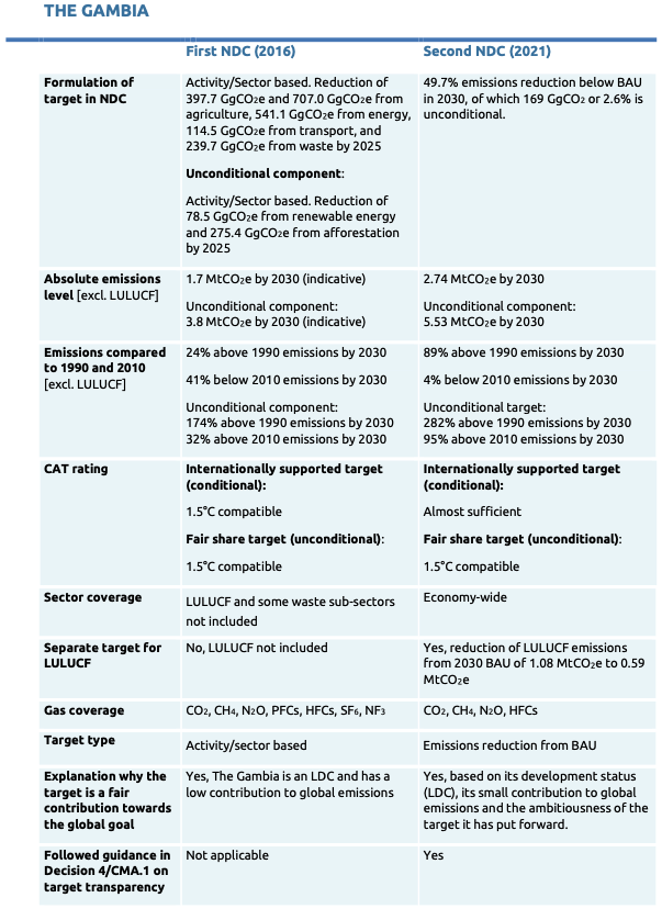 In September 2021, The Gambia submitted its second NDC which set a new target of reducing GHG emission by 49.7% below business as usual scenario in 2030 (incl. LULUCF).