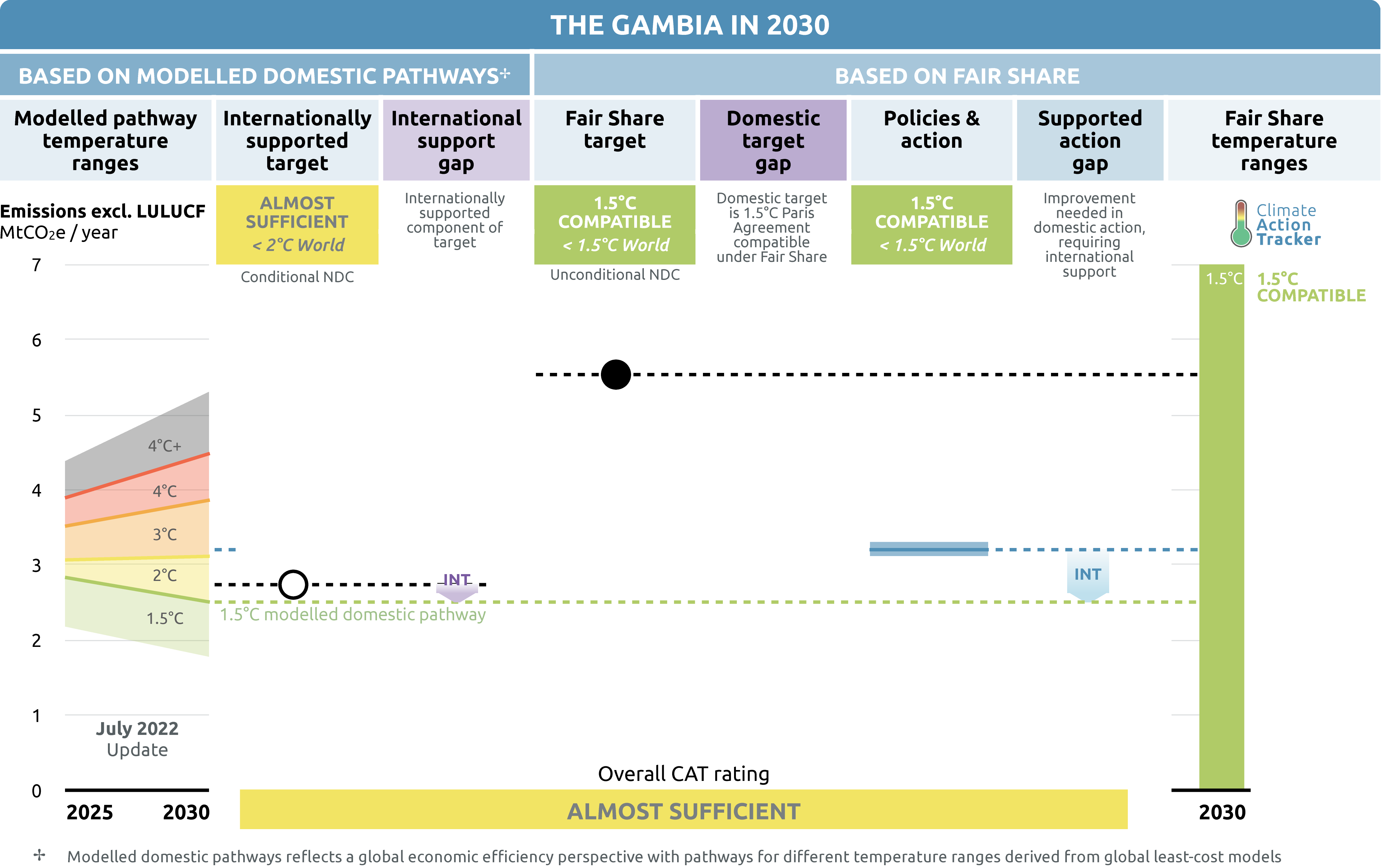 The CAT rates The Gambia’s internationally supported target as “Almost sufficient” against modelled domestic pathways. The “Almost sufficient” rating indicates that The Gambia’s internationally supported target in 2030 is not yet consistent with limiting warming to 1.5°C but could be, with moderate improvements. If all countries were to follow The Gambia’s approach, warming could be held below—but not well below—2°C.