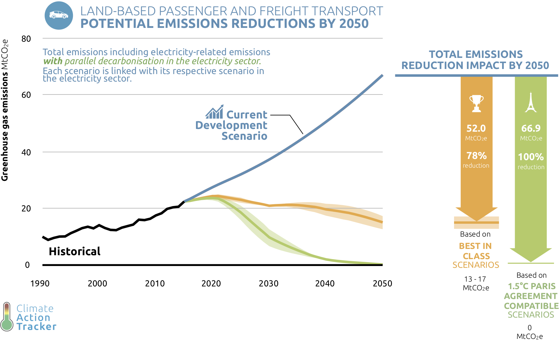In parallel to decarbonising electricity, strong electrification of the passenger vehicle fleet is required to bring the Turkish passenger transport sector onto a pathway in line with the Paris Agreement. Other influencing factors, besides electrification, include a shift towards a higher share of public transport. In our Paris Agreement compatible scenarios, such actions reduce emissions in this sector by around a third in 2030 from today, and reduce them to zero by 2050.