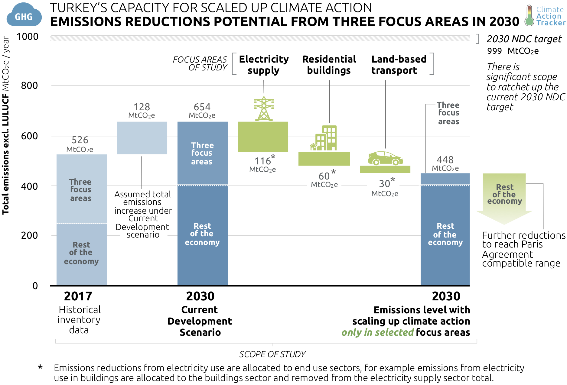 In Turkey, there is tremendous potential to scale up climate action, including in the focus areas of this study, that is: electricity supply, road and rail passenger transport, and residential buildings. Increasing climate action now would initiate technically-feasible sectoral transitions towards a zero-emissions society while directly benefiting Turkey’s sustainable development agenda. This report, the fifth country assessment in the Climate Action Tracker's Scaling Up Climate Action Series, analyses three key areas where Turkey could accelerate its climate action: electricity supply, road and rail passenger transport and the residential buildings sector. The report illustrates GHG emissions reductions from such actions, along with other benefits for sustainable development.
