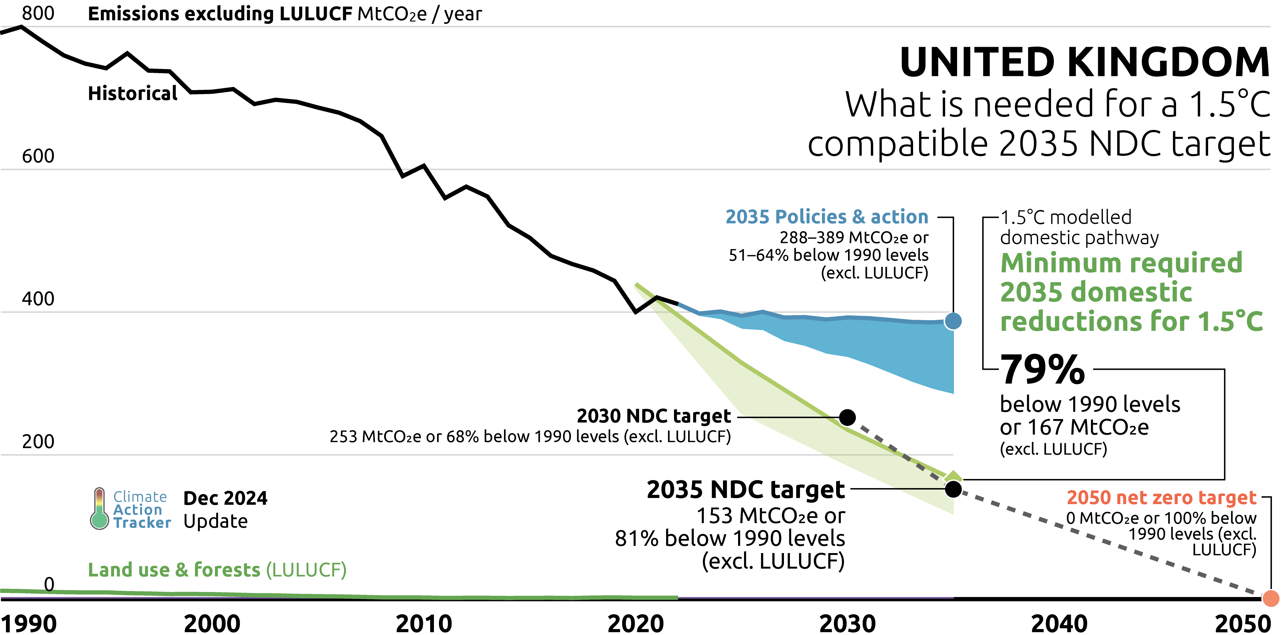 The submitted NDC of 153 MtCO2e in 2035 is 1.5°C compatible against modelled domestic pathways because it is slightly below the 1.5°C compatible threshold of 167 MtCO2e excluding LULUCF, however, the UK's its 2030 target of 253 MtCO2e is still slightly above the 236 MtCO2e threshold for 1.5°C MDP excluding LULUCF.