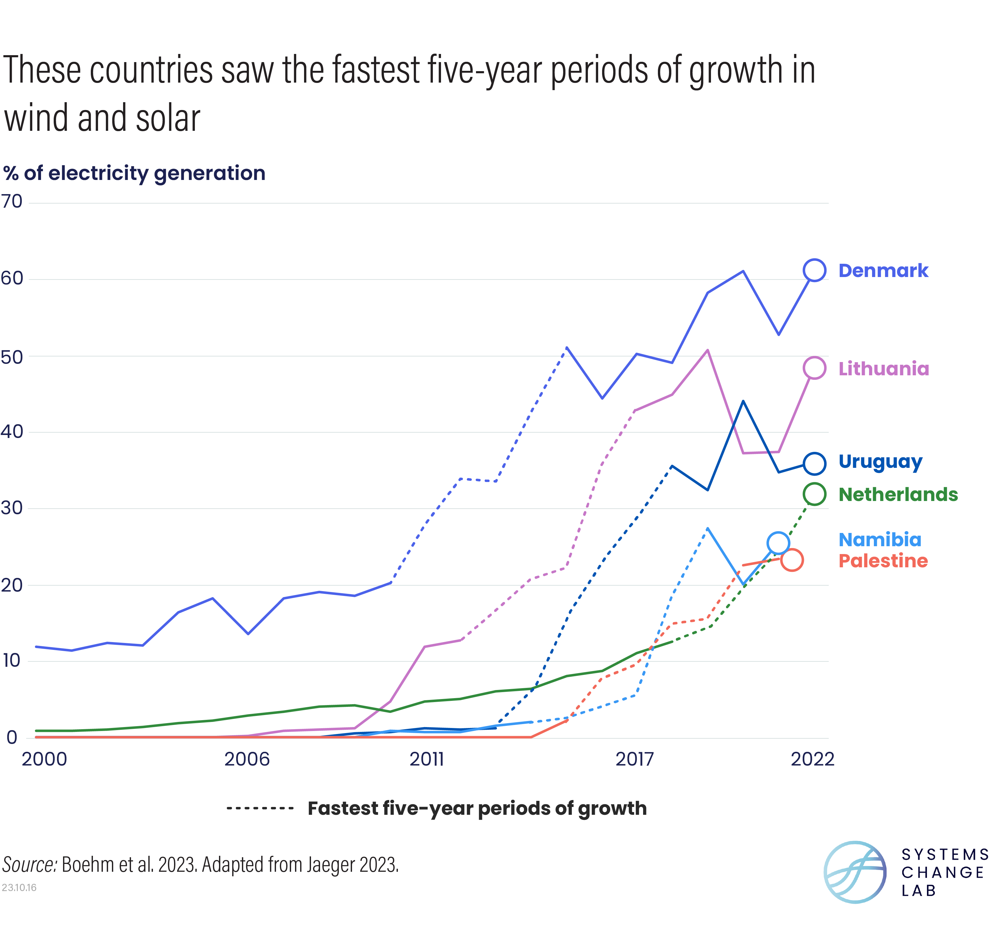 In 2022, carbon dioxide (CO2) emissions from electricity generation reached an all-time high, but rapid growth in both renewable energy installation and generation suggests that power sector emissions have plateaued and may start to fall this year. Zero-carbon technologies, such as solar and wind power, are widely mature and commercialized, and the cost of renewable energy, as well as complementary energy storage technologies, continues to plummet at unprecedented rates. Solar photovoltaics and onshore wind, specifically, are now the cheapest sources of new-build generation for at least two-thirds of the global population. Driven by these falling costs, recent years have witnessed record-breaking increases in adoption of these technologies, with strong evidence of ongoing exponential growth for solar.