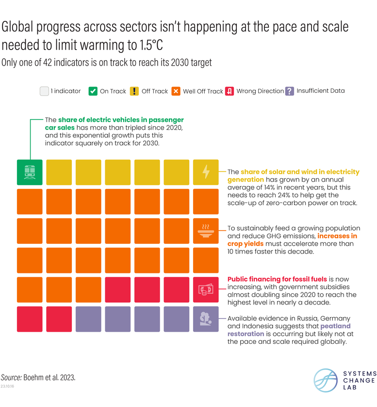 To help answer these questions, the State of Climate Action 2023 report provides a comprehensive roadmap of what’s needed by 2030 and 2050 to limit warming to 1.5 degrees C (2.7 degrees F), the limit scientists say is necessary for preventing increasingly devastating and irreversible impacts of climate change. It sets out the specific targets each sector will need to hit to achieve Paris Agreement goals and assesses where the world is today. This year’s analysis shows that of the 42 indicators of progress assessed, only one — sales of electric cars — is on track to reach its 2030 target and help keep 1.5 degrees C within reach.
