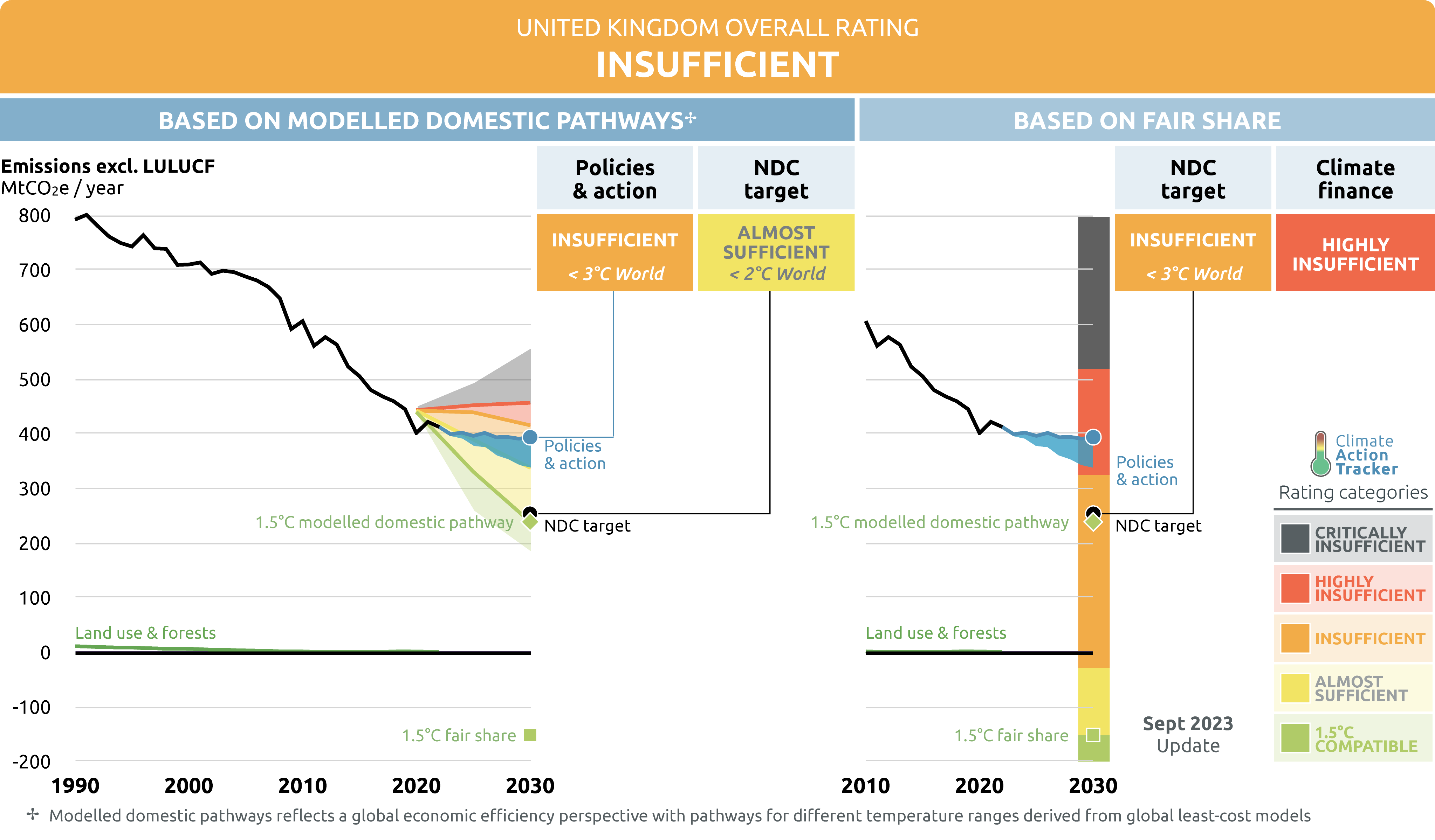 In our 2023 UK analysis, we found that less than 20% of the greenhouse gas emission cuts needed to meet the UK’s current 2030 target are covered by credible policies, amid continued delays to policy design and implementation, and an active weakening of key existing policies. We will update this analysis later this year once the new government has begun work.