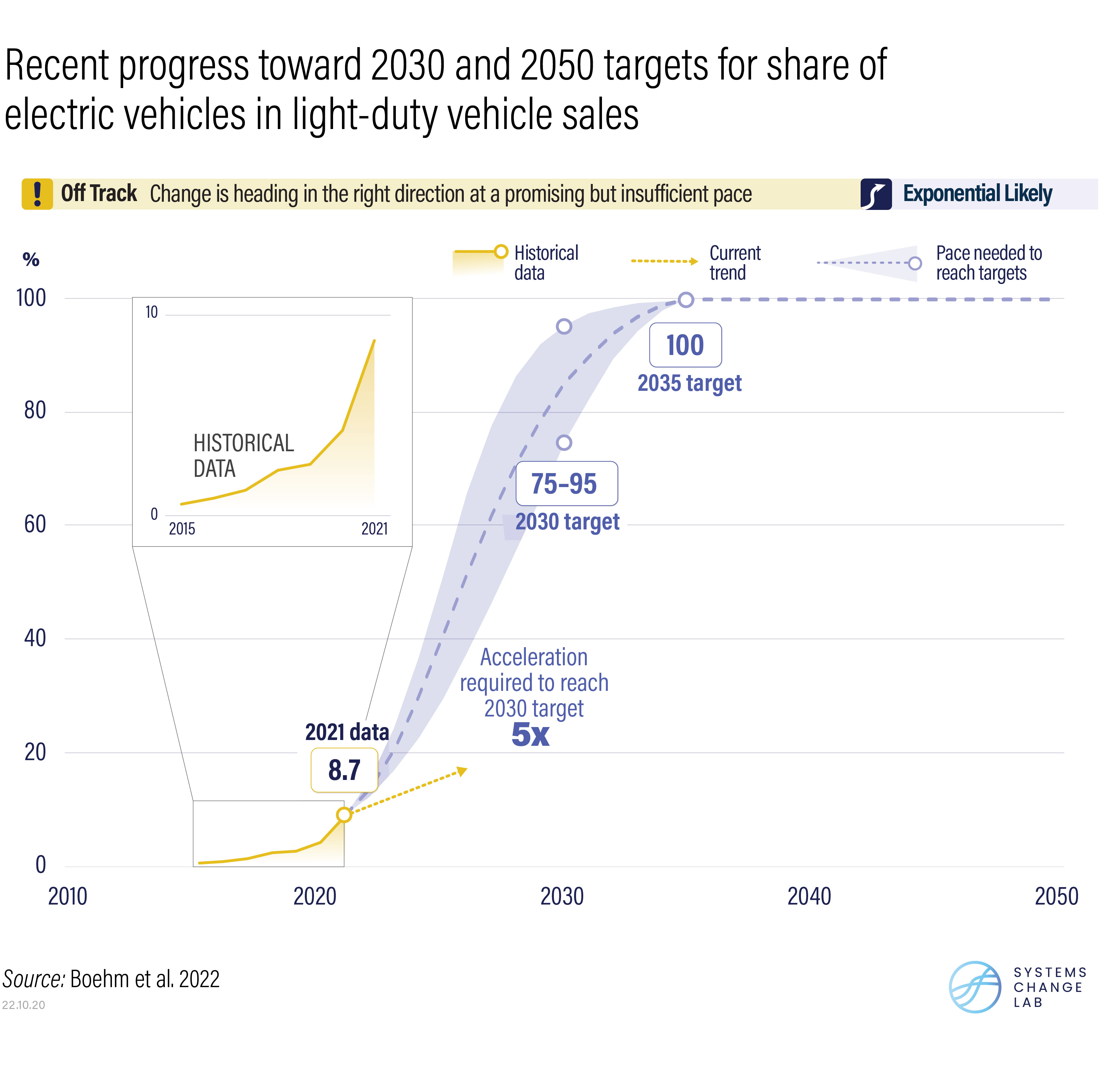 Where these modal shifts may prove difficult to achieve, electric vehicles (EVs) can fill in the gaps. The good news is that this transition is beginning to take off. The share of EVs in light-duty vehicle sales, for example, reached almost 9% in 2021 — a doubling from the year before. And in many major markets, EVs are already cost-competitive with fossil fuel-powered cars. These promising signs of accelerating growth suggest that electric passenger car adoption, which must move five times faster over this decade, will likely experience exponential change in the coming years.