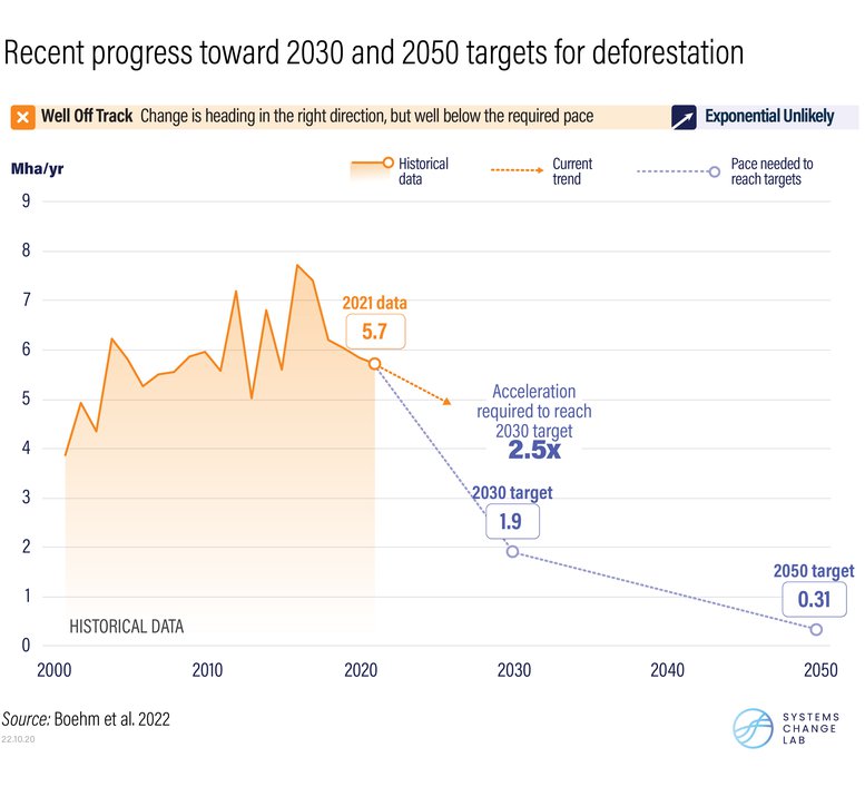 Yet global initiatives to protect these ecosystems remain woefully insufficient. From 2015 to 2021, deforestation occurred across an area roughly the size of Iraq (45 million ha), emitting a total of 25 GtCO2e, or roughly 42% of global GHG emissions in 2019. Worse still, nearly half of these losses happened in humid tropical primary forests, among the world’s most important lands for biodiversity and carbon storage. Getting on track for 2030 requires that annual declines in deforestation occur 2.5 times faster — equivalent to avoiding deforestation across an area roughly half the size of Puerto Rico each year.