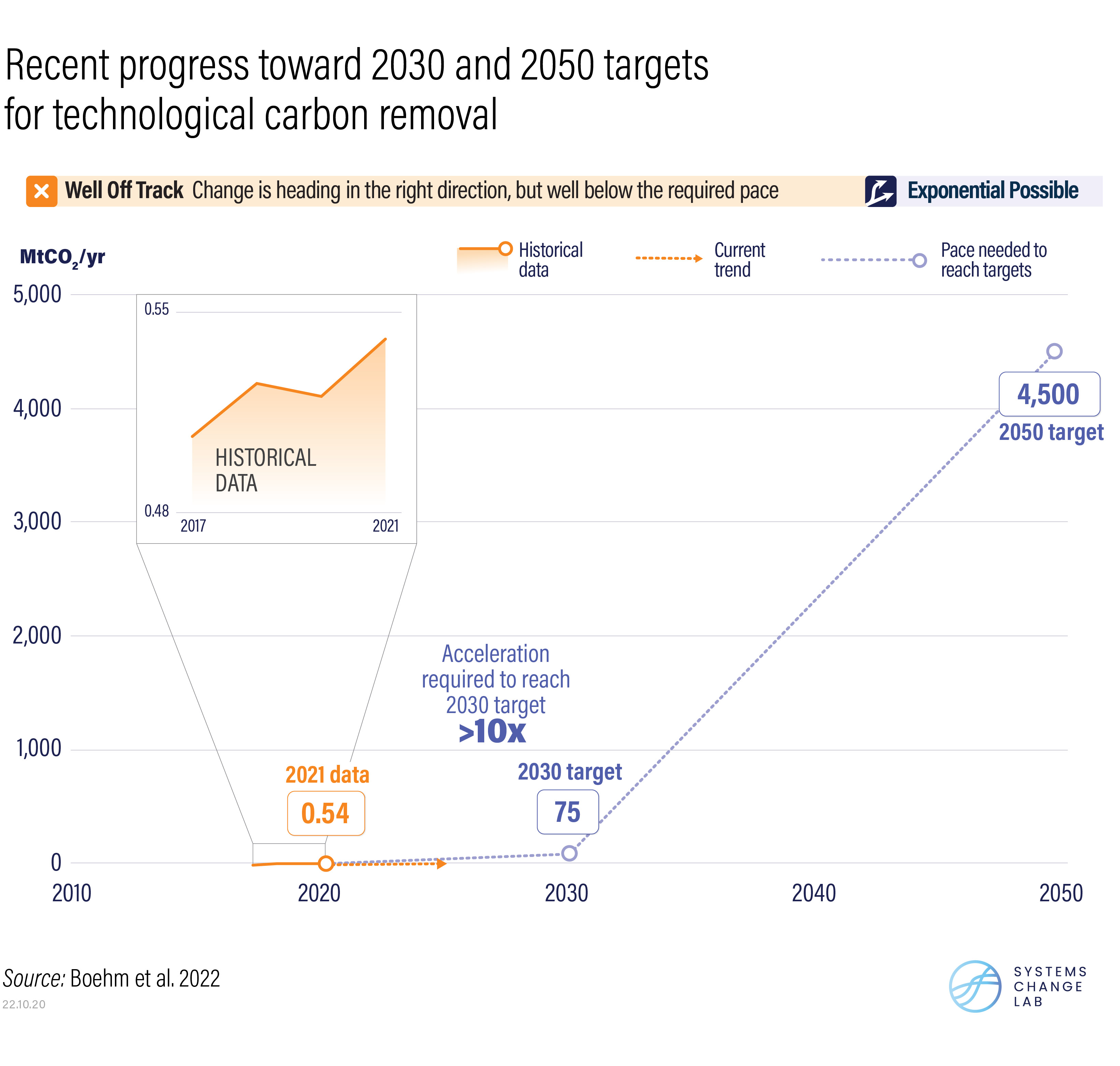 The latest climate science finds that reducing emissions is not enough — holding warming to 1.5˚C will also require removing carbon from the atmosphere, using both natural approaches like reforestation and carbon-removal technologies. The scale of change required over this decade is enormous. Today, existing technologies remove just 0.5 MtCO2 per year, less than 1% of the 75 MtCO2 needed annually by 2030. Getting on track to achieve this target will require a portfolio of technologies to capture and permanently store an additional 7.4 MtCO2 each year.