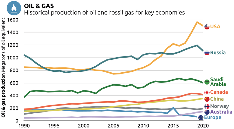 Figure 3: Oil and gas production in select countries from 1990 to 2020. Source: CAT data portal, based on IEA World Energy Balances