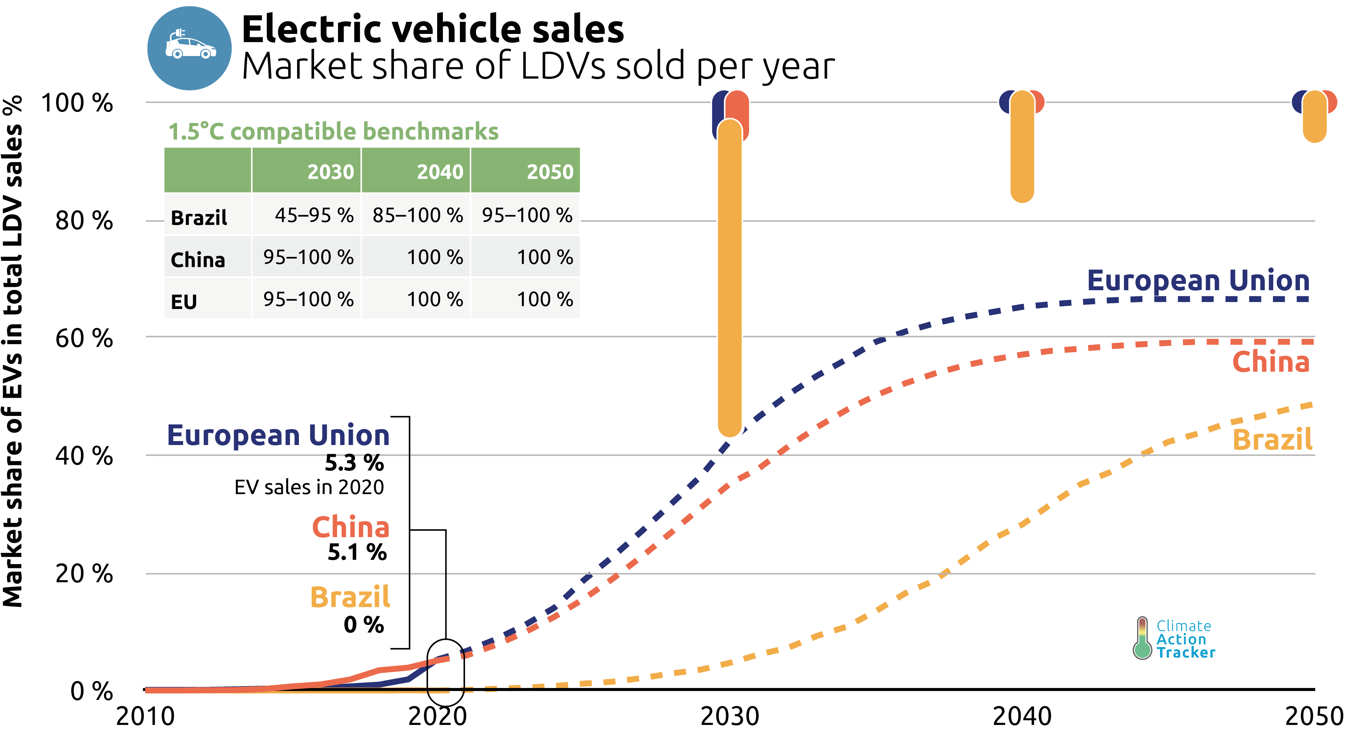 This is particularly relevant in the transport sector, as recent data demonstrates the significant progress achieved in the sale of electric vehicles as a share of total light duty vehicle sales (Figure 2). This also illuminates the divergence in performance between countries, with China and the EU making significant strides in recent years, while others like Brazil continue to lag badly. Figure 2 also clearly shows the wide variation in projected improvements under current policies, while no countries are projected to come close to reaching their 1.5°C benchmarks.