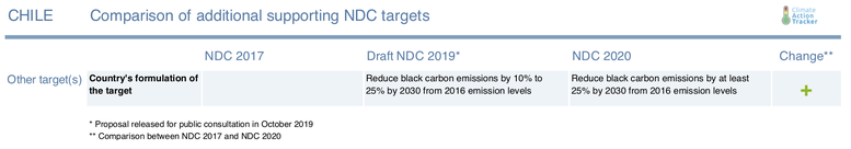 Chile’s updated NDC includes a separate target for black carbon emissions. It has committed to reducing those emissions by at least 25% below 2016 levels by 2030. This is a stronger target than that proposed in the October 2019 draft, which had a target of between 10 to 25%. A black carbon emission reduction target was not included in Chile’s first NDC.
