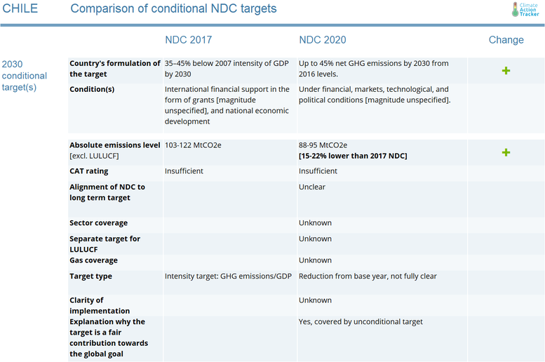 On 9 April 2020, the Chilean Government officially released its updated NDC, which is more ambitious than its first NDC submitted to the UNFCCC in 2017 and also slightly more ambitious than an earlier draft NDC of 2019. However, its projected emissions still fall in the ‘Insufficient’ CAT range. Chile needs to go even further if it aims to become compatible with the Paris Agreement’s 1.5° limit.
