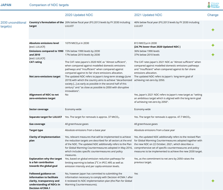 Japan’s updated 2030 Paris Agreement target commits to reducing emissions by 46% below 2013 levels and to continue its challenge towards a 50% reduction. While the government did not fully live up to the expectations in the lead-up to Glasgow COP that it would commit to a 50% reduction target and join the club of global climate leaders, the new NDC is a significant step up from the 26% reduction target in its previous NDC. A recent CAT briefing estimated that a 60% reduction by 2030 would be required for Japan to be 1.5°C-compatible.