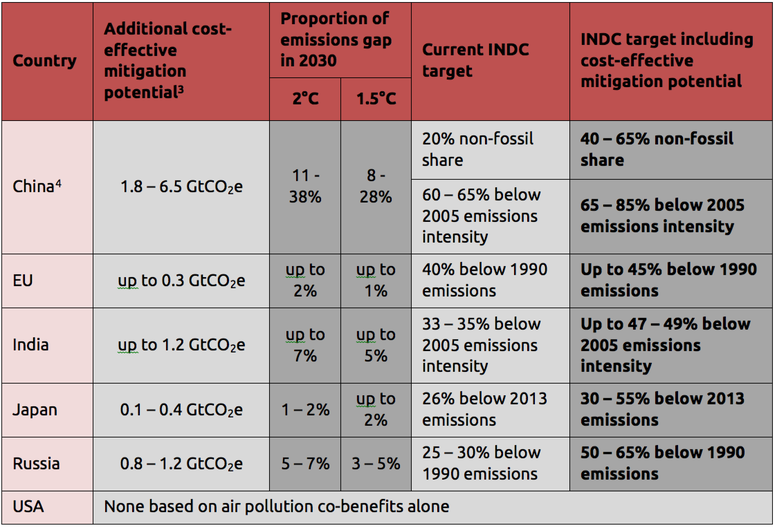 - Our result show that the emissions gap in 2030 between governments’ INDCs and the 2°C temperature goal, currently around 17 GtCO2e,could be closed by 4.6 – 7.8 GtCO2e or 27-46%, without imposing additional economic burdens on those undertaking the additional effort.