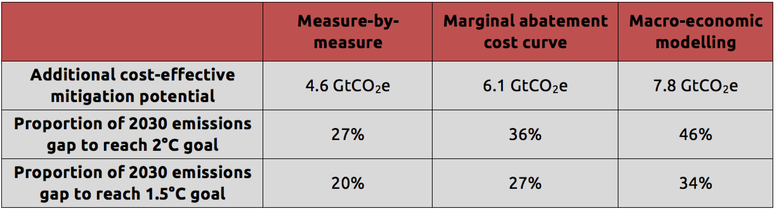 - For the 1.5°C temperature goal, the larger emissions gap in 2030 of around 23 GtCO2e could be closed by 20-34%.
