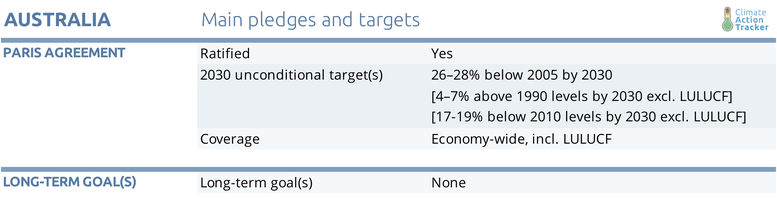Australia’s emissions from fossil fuels and industry continue to rise, and are now 7% above 2005 levels. These emissions have increased by around 1% per year on average since 2014, the year in which Australia’s national carbon pricing scheme was repealed. Under current polices, these emissions are headed for an increase of 8% above 2005 levels by 2030, rather than the 14-17% decrease in these emissions required to meet Australia’s Paris Agreement target (excluding LULUCF). This means Australia’s emissions are set to far outpace its “Insufficient” 2030 target.