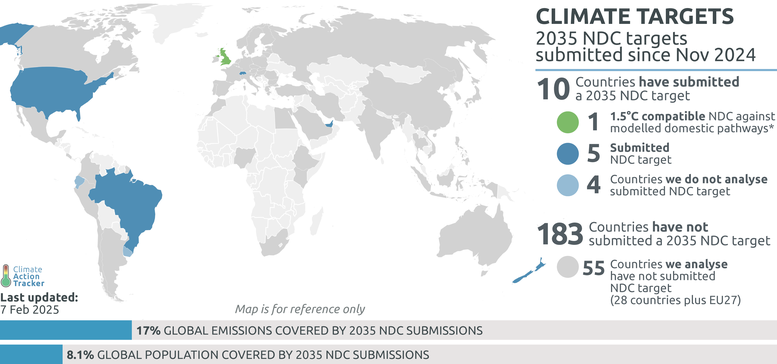 Only six of the countries the Climate Action Tracker analyses (1) have submitted their new 2035 climate targets in time for the Paris Agreement's 10 February 2025 deadline, and only one — the UK — is proposing actions at home that are 1.5°C-aligned.