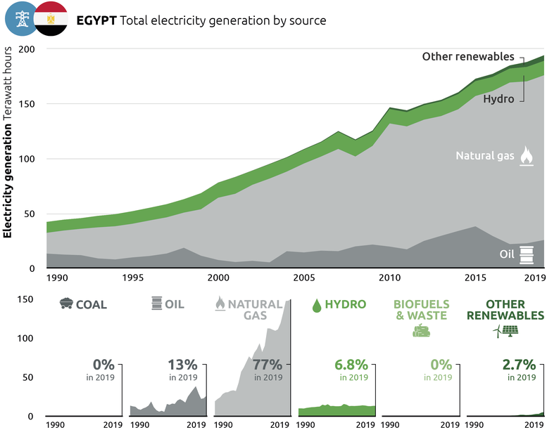 Egypt’s economy is highly dependent on the fossil fuel industry, which represented nearly a quarter of GDP in 2019–2020 (U.S. ITA, 2021). The energy sector is dominated by fossil fuels, with renewable energy supplying only 5% of total primary energy in 2019 (IEA, 2021).