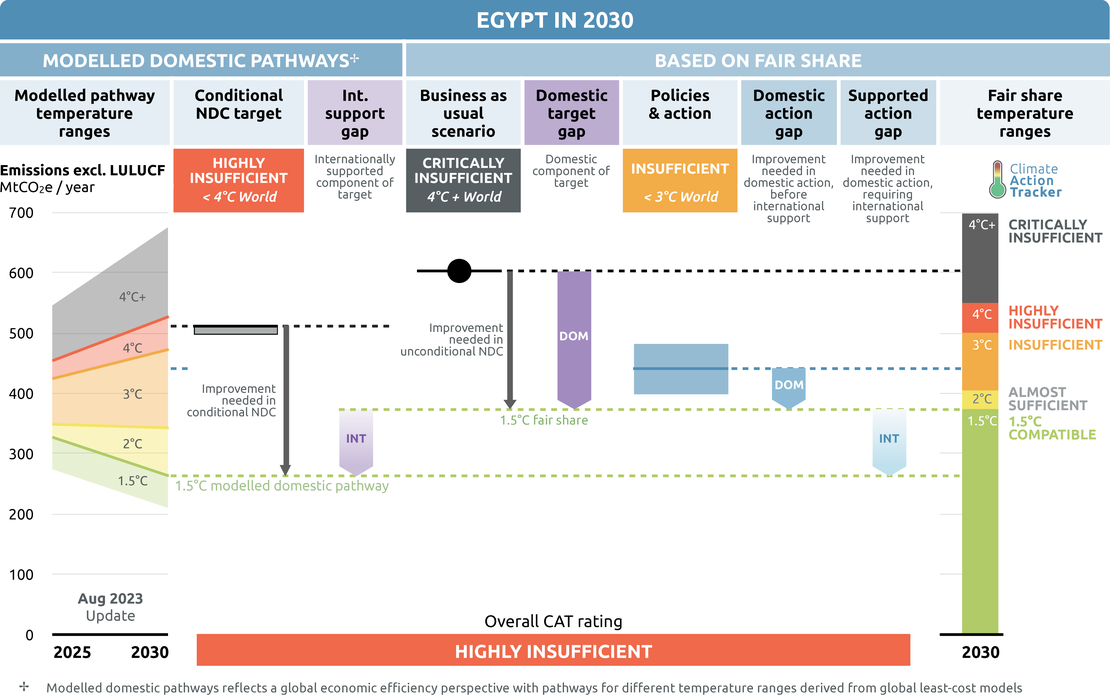 The CAT rates Egypt’s policies and action as “Insufficient” when compared to its fair share. The “Insufficient” rating indicates that Egypt’s climate policies and action in 2030 need substantial improvements to be consistent with the 1.5°C temperature limit. If all countries were to follow Egypt’s approach, warming would reach over 2°C and up to 3°C.