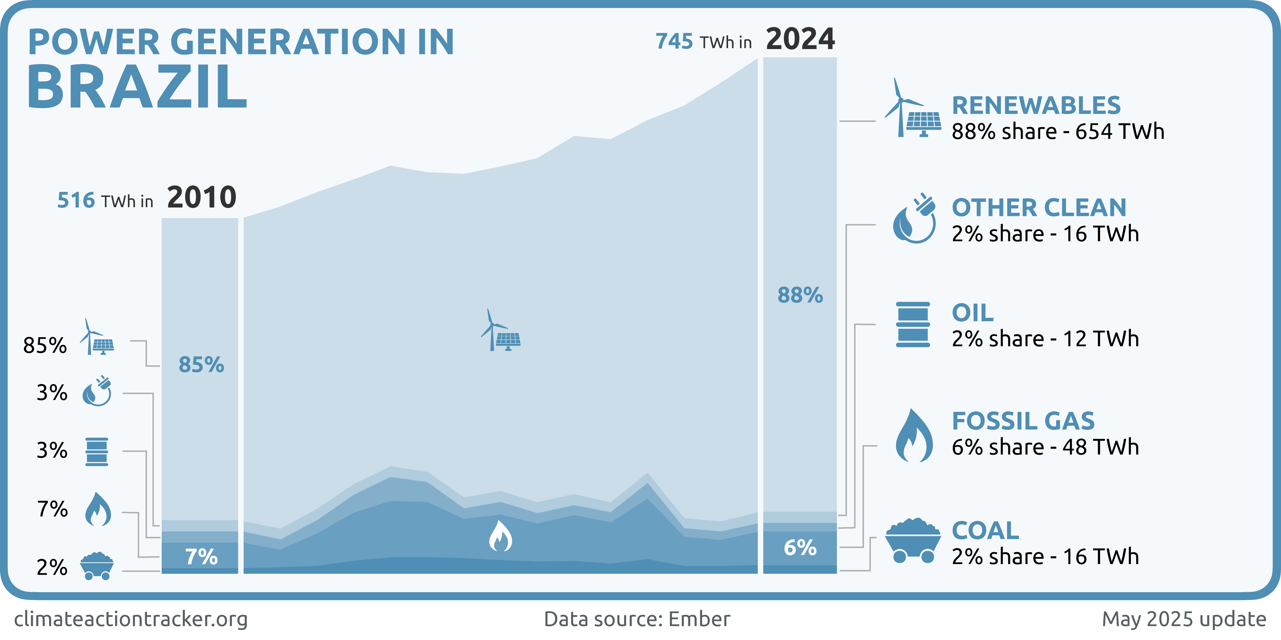 Brazil’s power sector is dominated by renewables which represented almost 90% in 2024 making Brazil’s power grid one of the world's cleanest. Though the high share of renewables is primarily due to hydroelectricity in the system, Brazil has significantly ramped up wind and solar deployment in the last five resulting in an increase in the share of wind and solar in power generation from about 11% to 25%. Fossil gas, coal, oil and nuclear make up the remaining 10% of electricity generation. The historical reliance on hydropower has exposed vulnerabilities as Brazil faced historic droughts that have led to decreased hydro power generation but instead of planning to replace this with other renewable sources, the government plans to also increase fossil fuel use (Ministry of Mines and Energy, 2022; Talanoa, 2023).