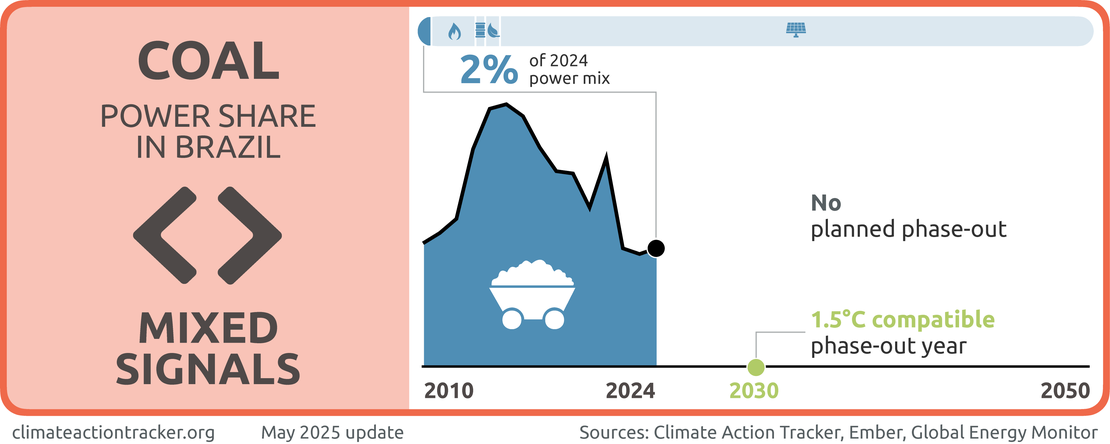 Coal represented 2% of Brazil's electricity generation in 2024 and it’s share has been decreasing over the last five years at a rate of about 0.3% per year. Despite its small and decreasing share in the power mix, we evaluate progress in this sector as sending "Mixed signals" given Brazil actually plans to expand coal capacity in the near future, does not yet have a coal phase-out target and has not adopted COP26's initiative to transition away from unabated coal power and to cease building new plants. To be 1.5°C compatible, Brazil would need to phase out coal in power generation by 2030.