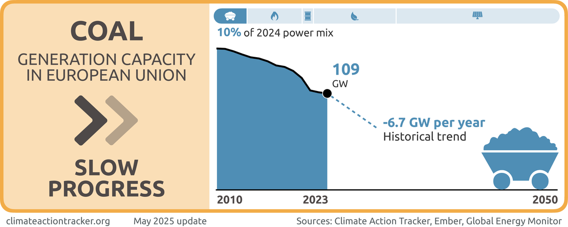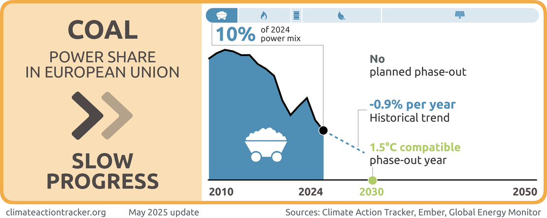 The EU’s share of coal in the power mix has decreased only marginally from 13% in 2020 to 10% in 2024. Despite this small share in the power mix and having signed up to the coal exit pledge at COP26, the EU has not committed to a coal phase-out date. Given the slow decrease of coal in the power and the lack of a phase out target, we evaluate the EU as making "Slow progress" on phasing out coal use in the power sector.