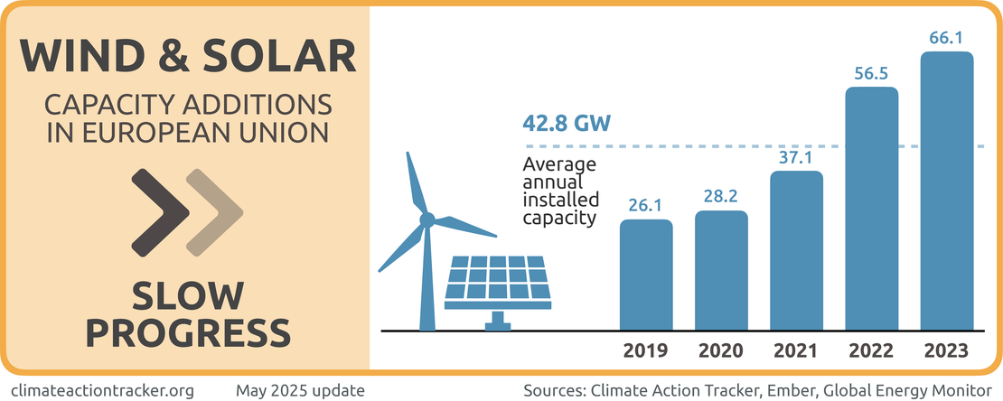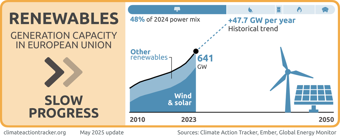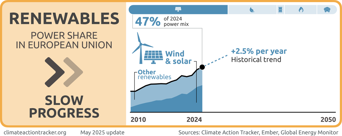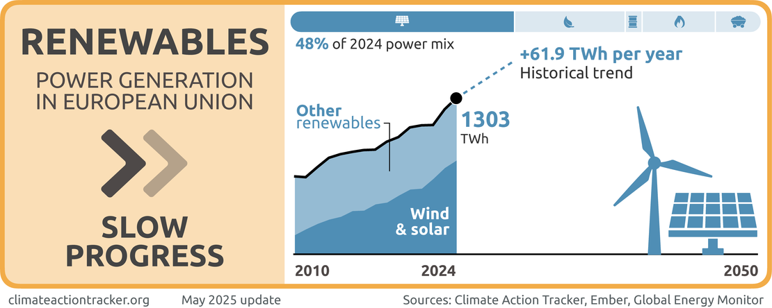 The EU is making progress, though slowly, on phasing out coal and ramping up renewables in its power sector, but fossil gas remains a sticking point with the EU sending mixed signals around its phase out. While the share of total electricity generated from renewable sources has increased to 49%, wind and solar generation deployment remains too slow.