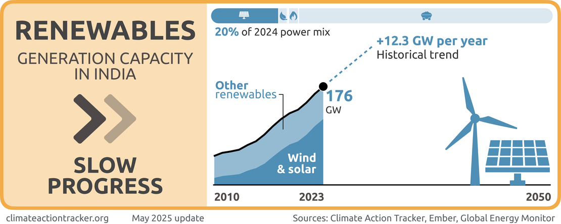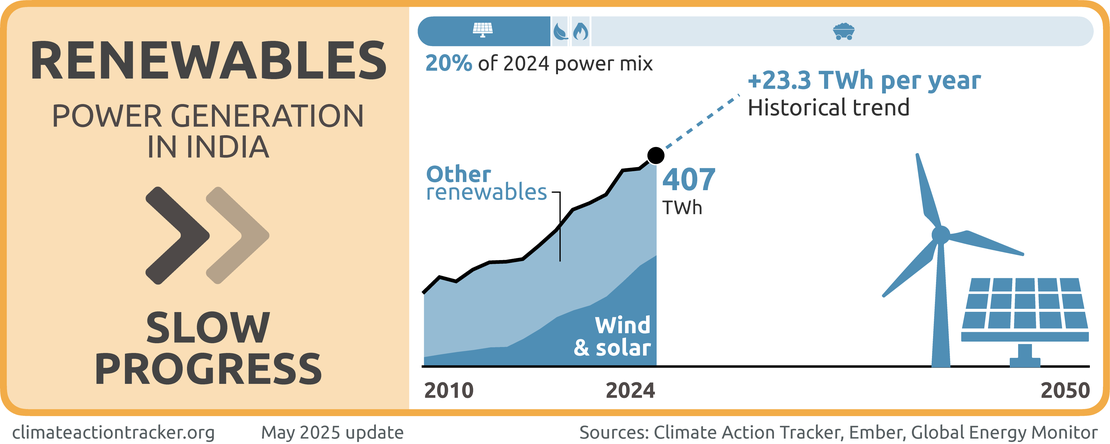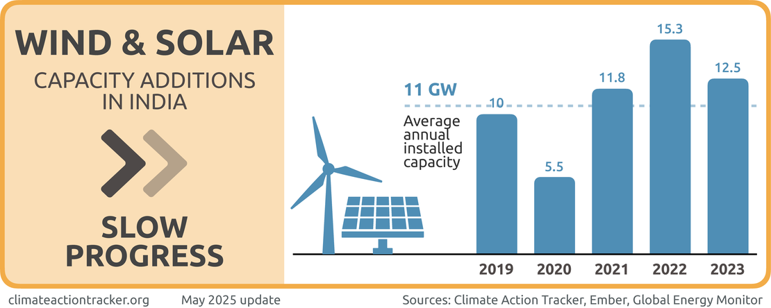 We evaluate India’s progress in renewables in the power sector as “Slow progress” (for detailed methodology on power sector evaluation please see here).