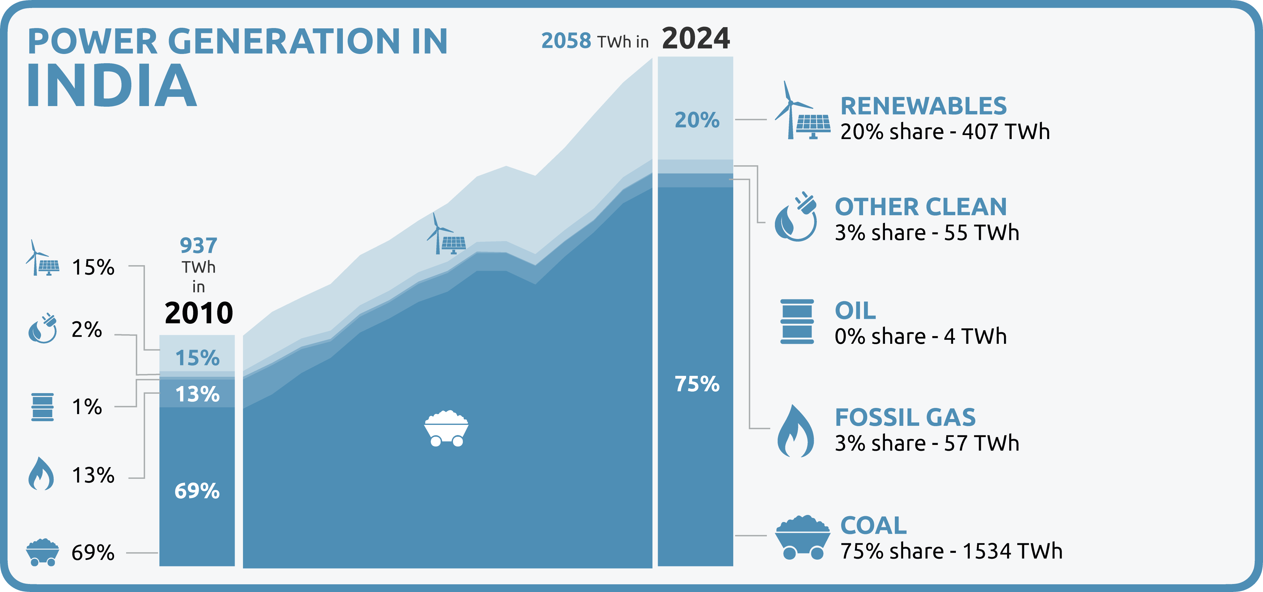 In 2024, an estimated 19% of the total electricity demand in India was attributed to hotter temperatures compared to 2023 (Ember, 2025b). As climate change continues to influence weather patterns in India, it is crucial to develop a robust power sector demand and supply plan, as India has a significant unmet cooling demand due to low air-conditioning ownership. This should be based on a transition to renewable energy to meet the peak load, supported by storage infrastructure. Without transferring the peak load to renewable energy sources with infrastructural support, India's dependence on coal will remain to meet summer demand.