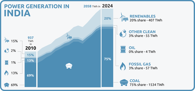India relies heavily on fossil fuel-based power generation, predominantly coal, which accounts for 75% of the country's current electricity generation. Renewables (including large hydro) make up the second largest share of India’s power generation at ~20% (Niti Aayog, 2024). Over the past five years, both coal and renewables have increased significantly in terms of absolute power generation, but their respective shares of power generation have remained close to constant.