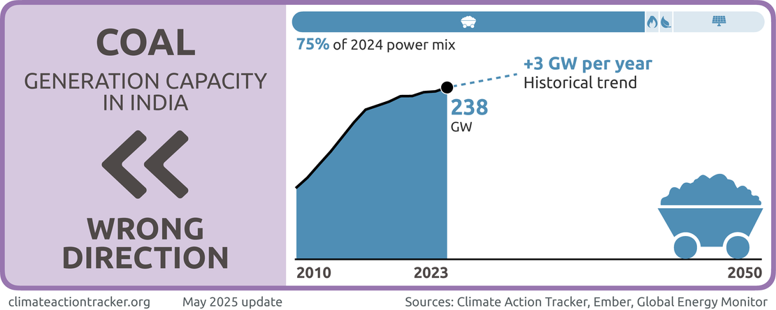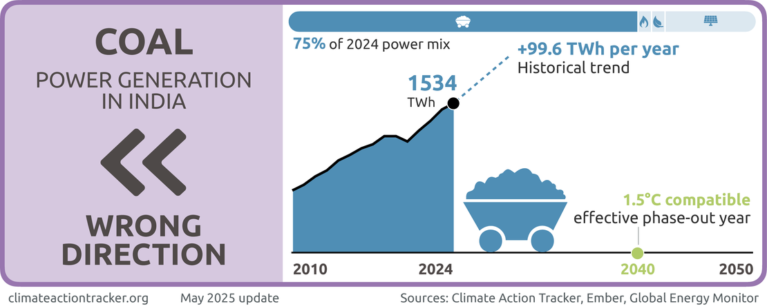 India’s electricity generation relies heavily on coal, representing over 75% of the country’s power mix. While the expansion of renewable energy has reduced coal’s share in installed capacity to below 50%, its contribution to actual generation remains high. Furthermore, almost 27 GW of new coal capacity is currently under construction and 92 GW in pre-construction (Global Energy Monitor, 2025b). Coal-based generation increased from 1295 TWh in 2023-2024 to 1332 TWh in 2024-25. This continued reliance on coal is clearly inconsistent with the 1.5°C temperature limit.