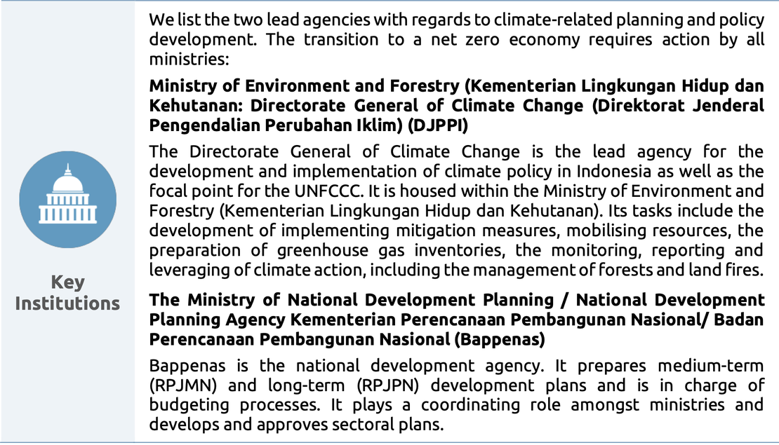 The Ministry of Environment and Forestry hosts the Directorate General of Climate Change, the official focal point of climate change policy planning but it has limited influence on climate action and sectoral plans as line ministries oftentimes act independently.