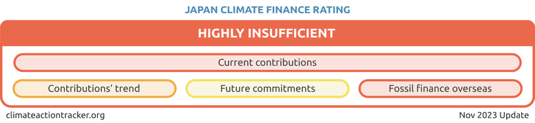 Japan reports significant levels of climate finance, but only a small share takes the form of grants or has climate as a primary objective (OECD, 2022). Japan also counts 50% of broader development projects as climate finance–- even though they are explicitly defined as not primarily targeting climate action (Carty & Kowalzig, 2022). The CAT accounted for these factors and the resulting finance considered in this rating is considerably lower than originally reported by the government.