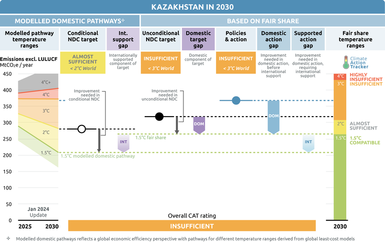 Kazakhstan’s target is at the least stringent end of what would be a fair share of global effort and is not consistent with the 1.5°C limit unless other countries make much deeper reductions and comparably greater effort.