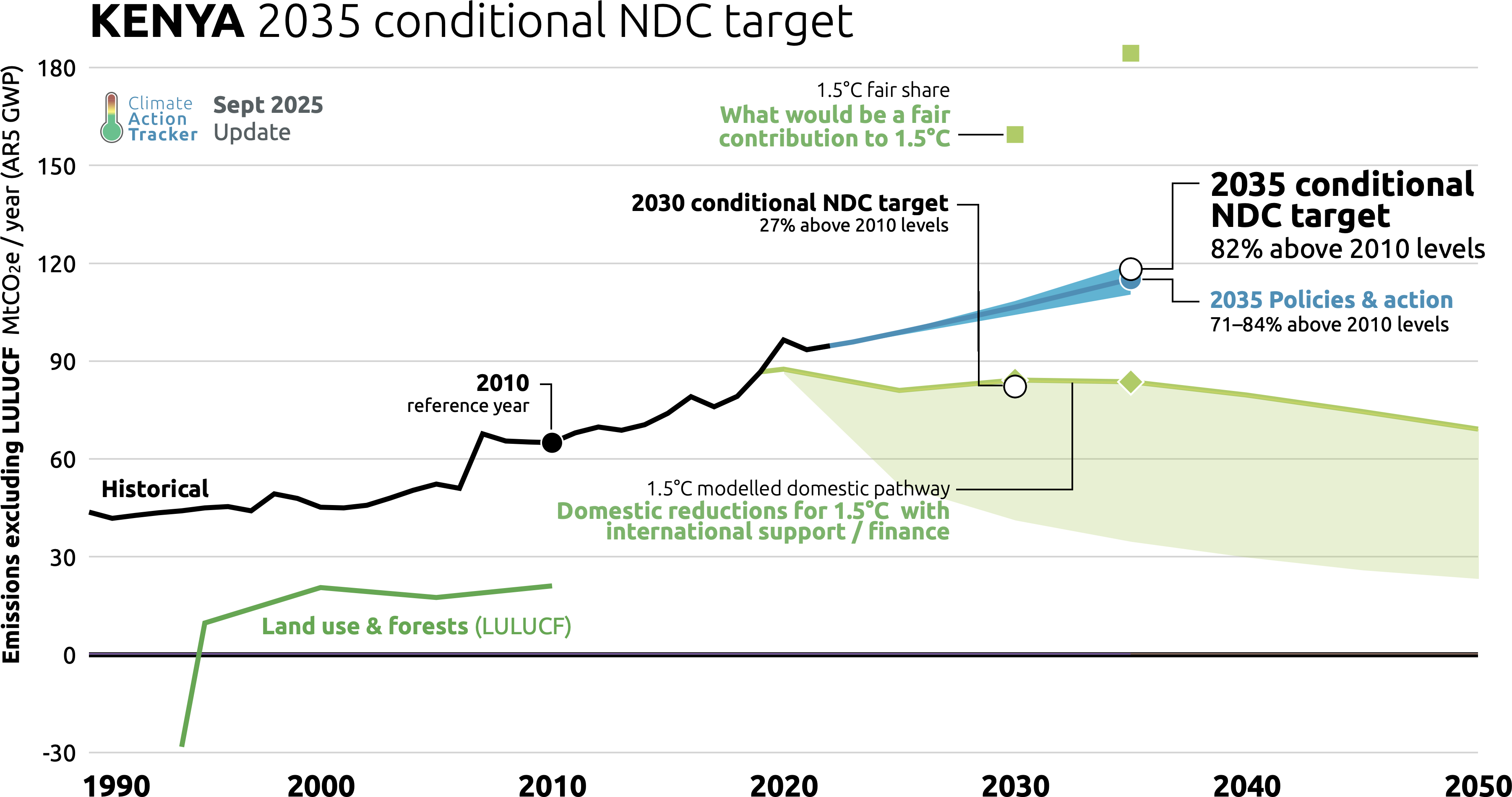 The CAT evaluates NDC targets excluding emissions from land use, land use change and forestry (LULUCF) to keep the focus on emissions from fossil fuel combustion and other relevant sectors, and because of the often-large uncertainty in estimates of LULUCF emissions and removals. This uncertainty is especially relevant because the LULUCF sector makes up nearly half of Kenya’s total emissions. According to our calculations, Kenya’s unconditional 2035 target translates to an emissions level of 169 MtCO₂e and the 2035 conditional target to 118 MtCO₂e, both excluding LULUCF (see Assumptions).