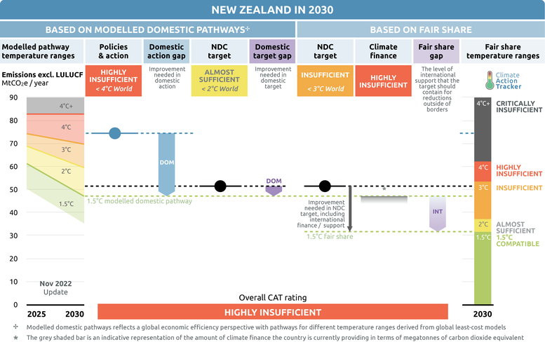 Taking both New Zealand’s emissions reduction target and climate finance into account, we rate the overall fair share contribution as “Insufficient”.