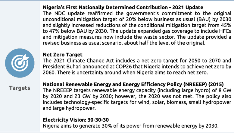 Nigeria’s policy processes have improved with the adoption of the Climate Change Act, though there is still scope for further enhancement. By setting into law a net zero target and establishing a five-year and annual carbon budget process, the Climate Change Act improves on the country’s near- and long-term planning. The government has also adopted its 2050 Long-Term Vision (LTV). The targets contained in the Act and Vision are not aligned, but further work to elaborate on the Vision is planned for 2022. Existing regulations outside the new climate law that address mitigation are fragmented and piecemeal.