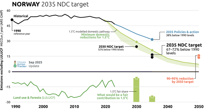 While Norway's 2035 NDC has an ambitious target that, if achieved, would go beyond the emissions reductions expected with current policies by 2035, it has missed an opportunity to increase the ambition of its 2030 target.