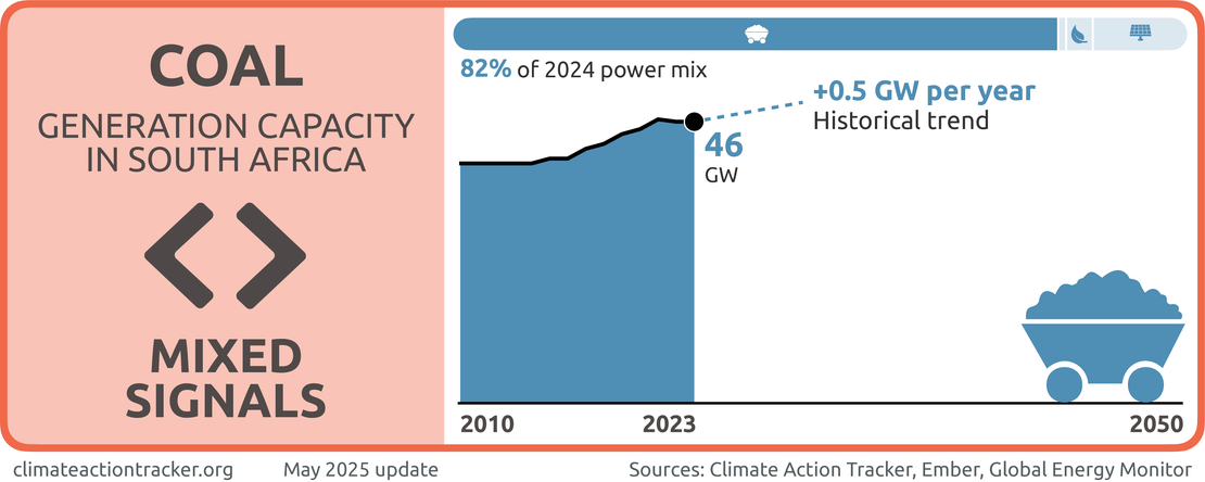 South Africa government is sending “Mixed signals” on coal. While the overall share of coal in the power sector has slowly declined in the last five years, the plant decommissioning roadmap appears to have been delayed, and new coal capacity was recently added to the grid.